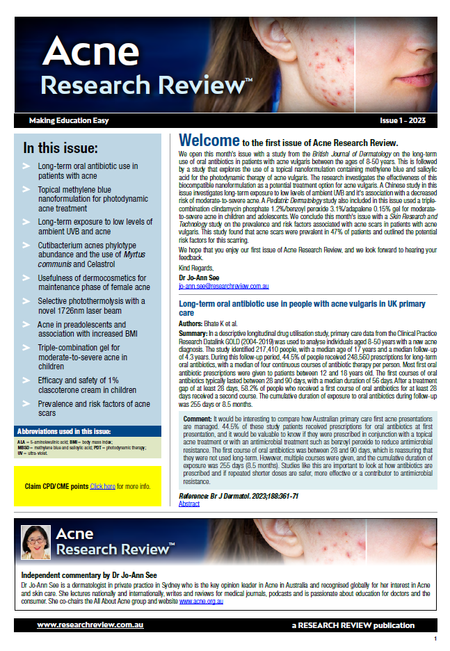 This Review features key medical articles from global journals with commentary from Dr Jo-Ann See. The Review covers topics such as acne vulgaris, acne scars, antibiotic use, photodynamic treatment and assessment of other available treatments.