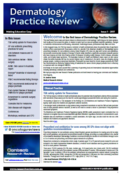 This Review features key medical articles from global Dermatology journals with commentary from Dr Warren Weightman and Clinical Associate Professor Saxon D Smith. The Review covers topics such as psoriasis, acne, vitiligo, rosacea and dermatitis.