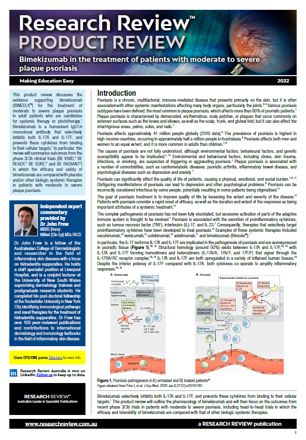 This review discusses pharmacological properties, mechanism of action and major studies featuring Bimekizumab. It also provides commentary and recommendations from Dr John Frew, staff specialist at Liverpool Hospital, and conjoint lecturer at the University of New South Wales.
