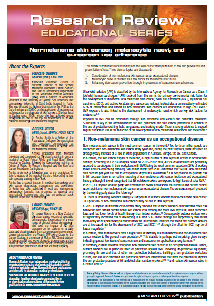 This review summarises recent findings on the skin cancer front pertaining to risk and prevalence and preventative efforts and has been kindly prepared with the assistance of dermatologists Associate Professor Pascale Guitera and Dr Annika Smith (Melanoma Institute Australia) and Dr Louise Reiche (New Zealand).