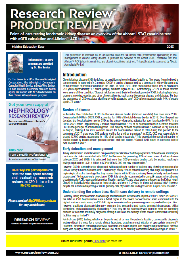 This review discusses burden of disease, early diagnosis, the Abbott i-STAT creatinine test, ACR testing, and the National strategic action plan for kidney disease. It also provides commentary from Dr Tim Senior, a GP at Tharawal Aboriginal Corporation, the Aboriginal Community Controlled Health Service in South West Sydney.