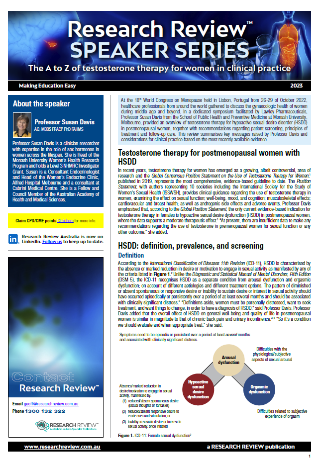 We’re delighted to add a summary of a recent event presented at the 18th World Congress on Menopause held in Lisbon, Portugal. The summary provides an overview of testosterone therapy for hypoactive sexual desire disorder in postmenopausal women.