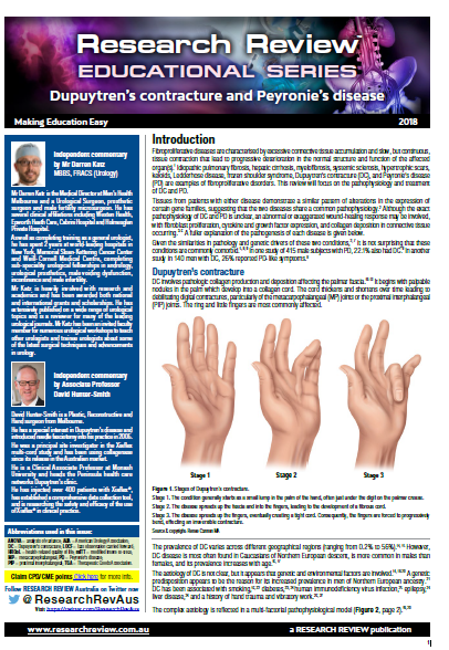 The review covers pathogenesis, disease diagnosis and treatment, and some key studies on Dupuytren's contracture and Peyronie's disease. Guiding commentary provided by Mr Darren Katz, the Medical Director at Men’s Health Melbourne and a Urological Surgeon, prosthetic surgeon and male fertility microsurgeon; and Associate Professor David Hunter-Smith, a Plastic, Reconstructive and Hand surgeon from Melbourne.