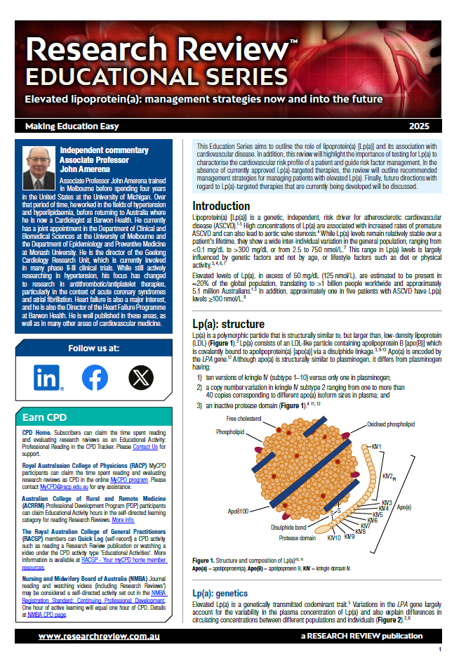 The review provides an overview of lipoprotein(a) structure and genetic variability, pathophysiology, association with cardiovascular risk, current management and future research directions. It also includes guiding commentary from Associate Professor John Amerena, a Cardiologist at Barwon Health and Director of the Geelong Cardiology Research Unit.