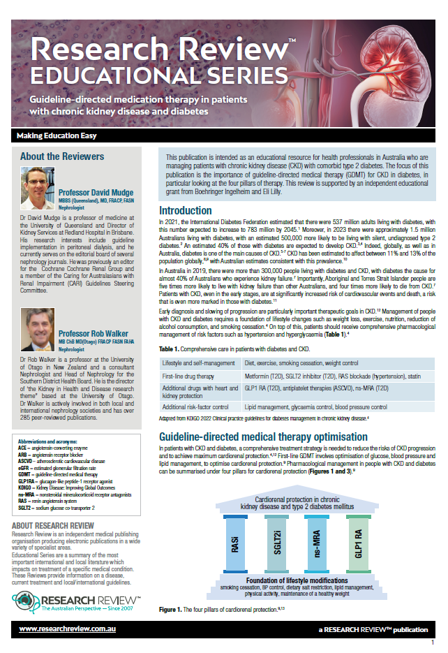 This review focusses on the importance of guideline-directed medical therapy (GDMT) for CKD in diabetes, in particular looking at the four pillars of therapy. It also includes guiding commentary from two nephrologists, Professor David Mudge from Queensland and Professor Rob Walker from New Zealand.