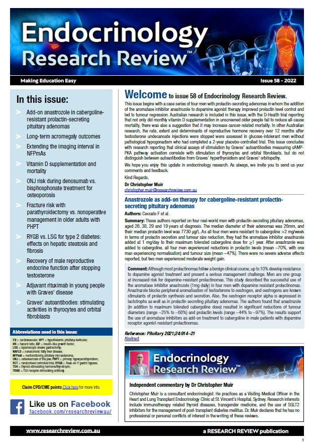 This Review features key medical articles from global endocrinology journals with commentary from Professor Mathis Grossman . The Review covers topics such as diabetes mellitus, hypothyroidism, graves's disease, endocrine disorders, endocrinology guidelines, pituitary gland disorders, sex hormone disorders, adrenal insufficiency, osteoporosis and polycystic ovary syndrome.