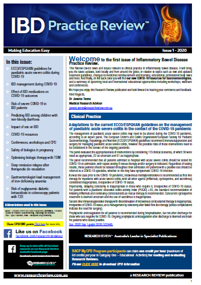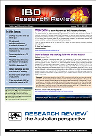 This Review features key medical articles from global gastroenterology journals with commentary from Associate Professor Jonathan Segal and Dr Alex Barnes. The Review covers topics such as Crohn's disease, ulcerative colitis, colonscopy, colitis, inflammatory bowel disease, biological drugs, and tumour necrosis factor (TNF) inhibitors.