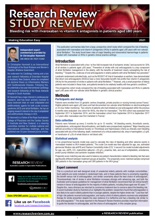 As part of our ongoing aim to bring you reports of interesting new studies, we have added a review of a recent study which examines bleeding risk with rivaroxaban vs vitamin K antagonists in patients aged ≥80 years.