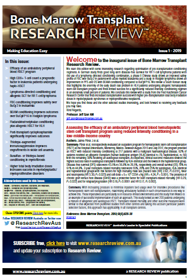 This Review features key medical articles from global haematology journals with commentary from Dr David Routledge and Dr Ashleigh Scott. The review covers topics such as assessing transplant programs, preconditioning, lymphoma and leukaemia treatment, sickle cell anaemia, myelofibrosis, and graft rejection.