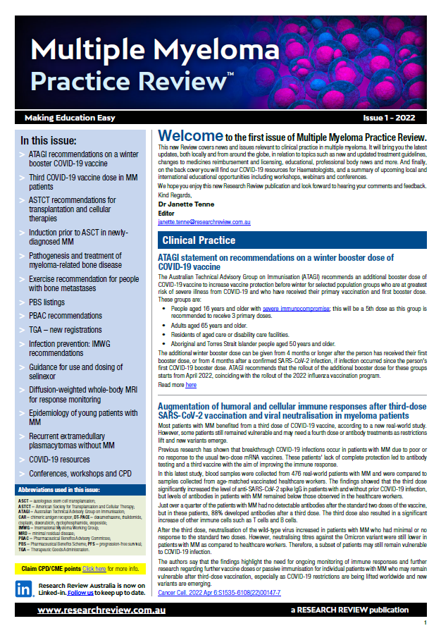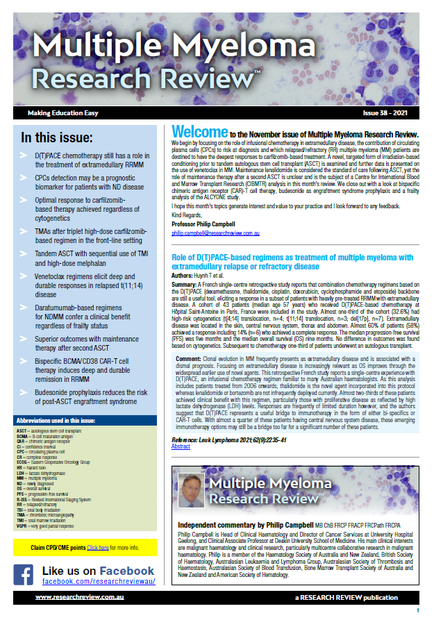 Professor Philip Campbell and Dr Adam Bryant. The Review covers topics such as bone marrow examination, stem cell transplants, plasma cell myeloma, malignant myeloma, smouldering multiple myeloma and proteasome inhibitors.