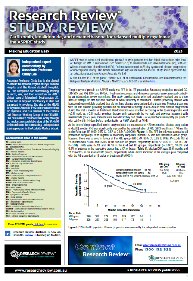 As part of our ongoing aim to bring you reports of new developments, we have added a short review of the ASPIRE study: carfilzomib, lenalidomide, and dexamethasone for relapsed multiple myeloma. This is the first of three new short studies which will be published over the next month.