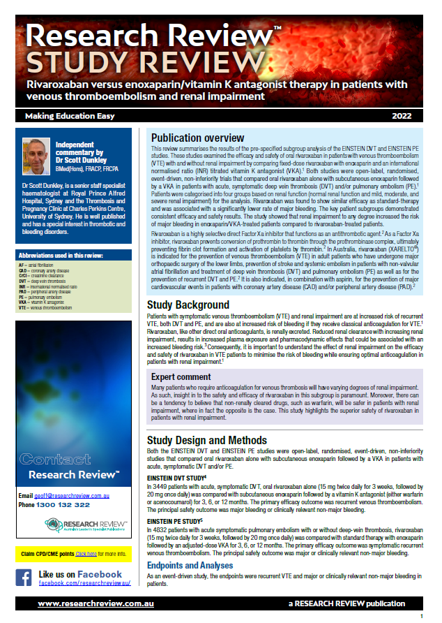 As part of our ongoing aim to bring you reports of interesting new studies, we have added a review of a study titled: Rivaroxaban versus enoxaparin/vitamin K antagonist therapy in patients with venous thromboembolism and renal impairment.