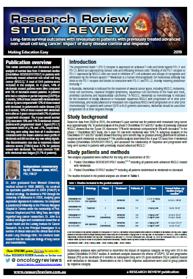 This review summarises pooled analysis of survival data from 4 nivolumab CheckMate studies in patients with previously treated advanced NSCLC.