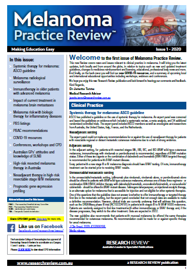 Melanoma Research Review is a unique Australian publication with commentary from Professors Michael Henderson and Peter Hersey. bringing you some of the most important melanoma research from around the world. The Review is a summary of what we think are the most significant new papers, plus local commentary on why they are important and how they can potentially affect practice.
