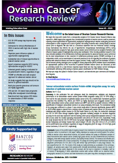 This Review features key medical articles from global oncology journals with commentary from Dr Rhett Morton. The Review covers topics such as epithelial ovarian cancer, recurrent ovarian cancer, oral contraceptives, chemotherapy, molecular markers.