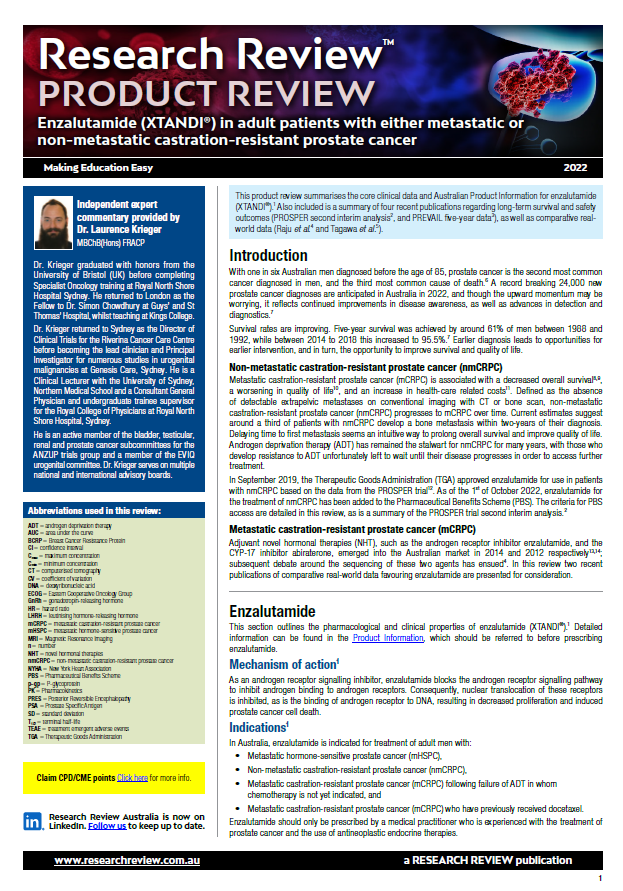 As part of our ongoing series focussing on available medicines in Australia, we have added a product review of Enzalutamide in adult patients with metastatic or non-metastatic castration-resistant prostate cancer.