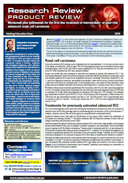 This Product Review discusses the use of nivolumab plus ipilimumab for the first-line treatment of intermediate- or poor-risk, advanced renal cell carcinoma.