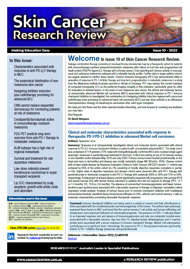 This Review features key medical articles from global dermatology and oncology journals with commentary from Dr. David Simpson. The Review covers topics such as melanoma, squamous cell carcinoma, basal cell carcinoma, skin diseases, dermoscopy and reconstructive surgery.