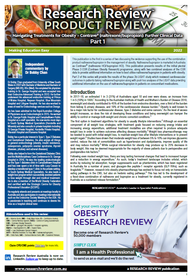 This review discusses evidence supporting the use of naltrexone/bupropion in the management of obesity. It also provides commentary and recommendations from Dr Bobby Chan, an Endocrinologist working at South Sydney Medical Specialists and consulting in St George Private Hospital, Hurstville Private Hospital, Waratah Hospital and Kareena Hospital.