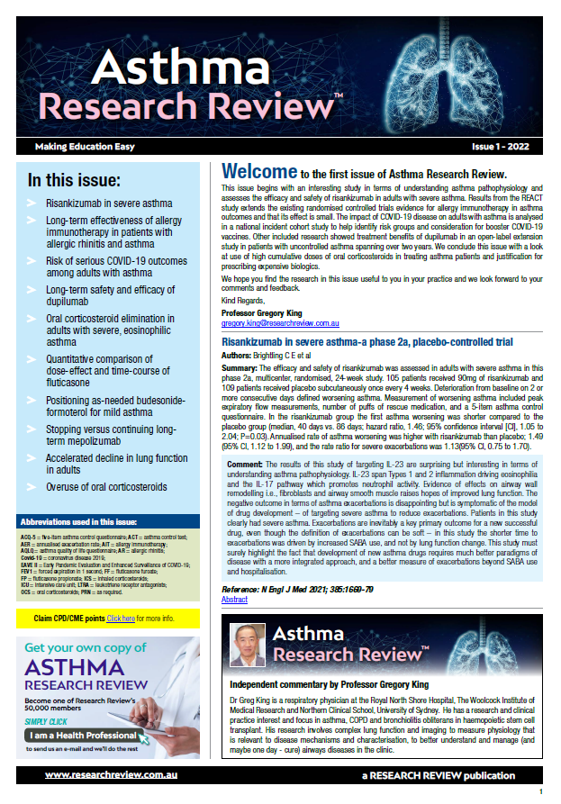 Dr Elizabeth Veitch and Professor Peter Wark. The Review covers topics such as eosinophilic asthma, allergic rhinitis, COVID-19 outcomes, and news on advancing treatments for asthma.