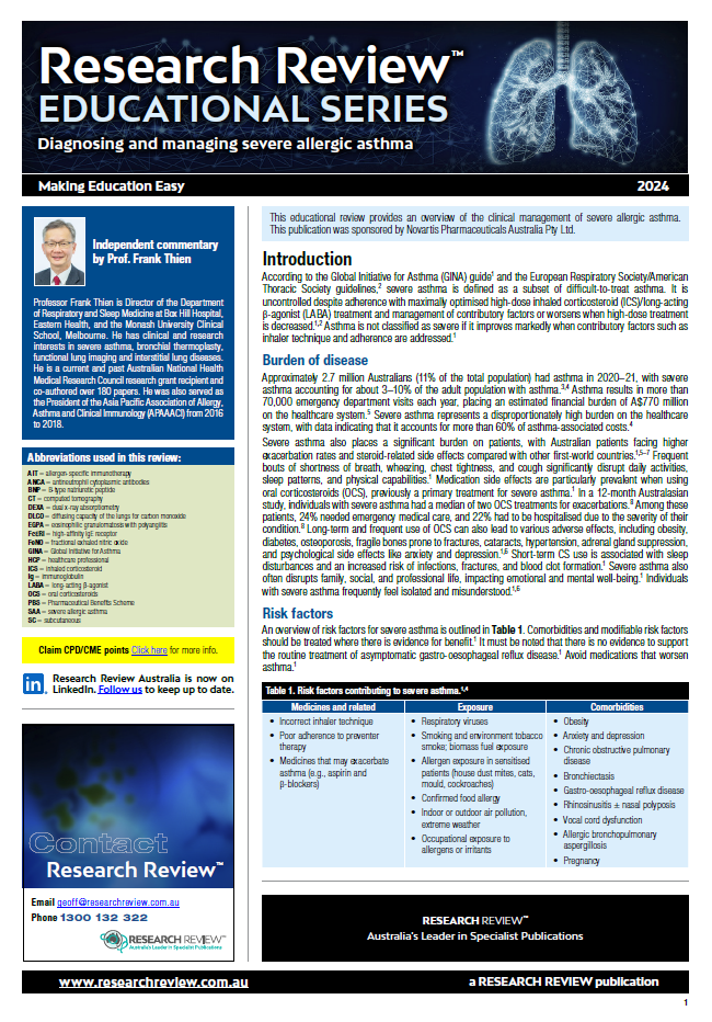 The review covers GINA guidelines and burden of disease in Australia, risk factors, diagnosis and the use of monoclonal antibodies as an add-on treatment option. It also includes guiding commentary from Professor Frank Thien, Director of the Department of Respiratory and Sleep Medicine at Box Hill Hospital, Eastern Health.