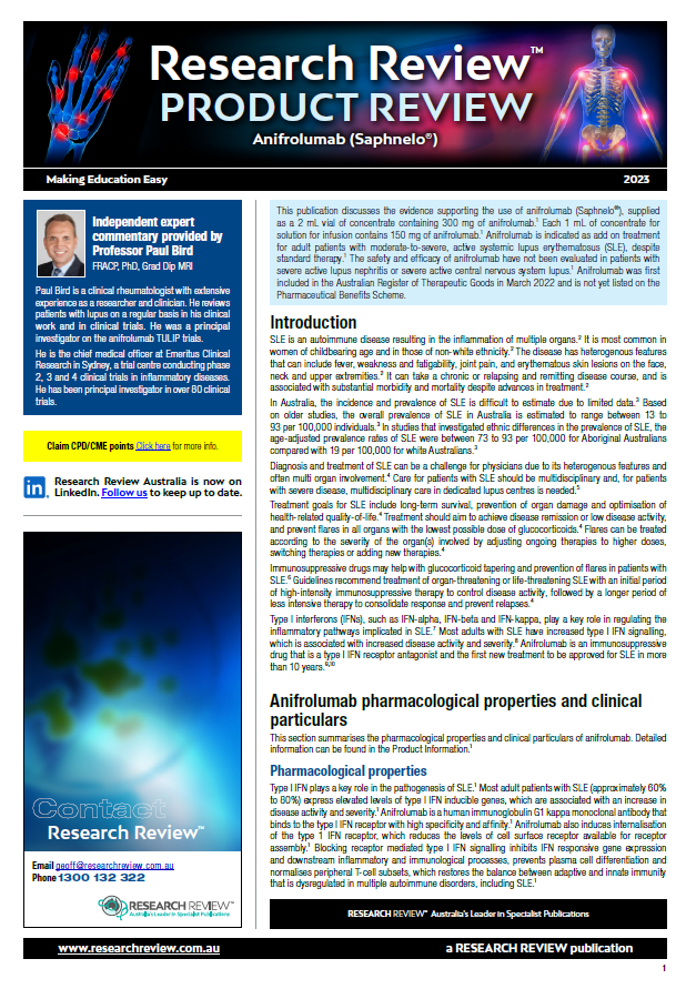 This review discusses pharmacological properties, drug interactions and major studies featuring Anifrolumab. It also provides commentary and recommendations from Professor Paul Bird a clinical rheumatologist, and chief medical officer at Emeritus Clinical Research in Sydney.
