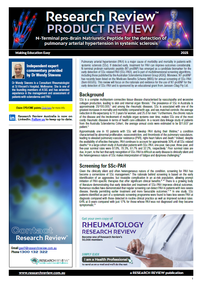 This review discusses screening for SSc-PAH, current guidelines, quantification of NT-proBNP in practice and a series of clinical studies. It also provides commentary from Dr Wendy Stevens, a Consultant Rheumatologist at St Vincent’s Hospital, Melbourne.