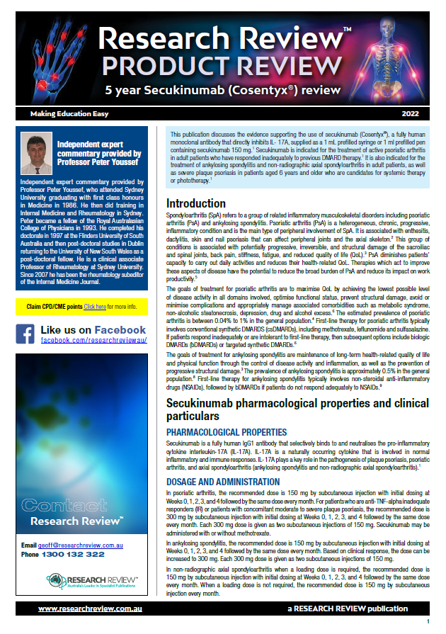 As part of our ongoing series focussing on available therapies in Australia, we have added a product review of the use of Secukinumab in spondyloarthritis, a five-year review.