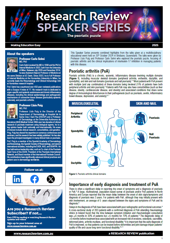 This is a summary of a multidisciplinary event featuring international experts Professor Lluis Puig and Professor Carlo Selmi who explored the psoriatic puzzle, focusing on psoriatic arthritis and the clinical implications of interleukin-17 inhibition in managing patients with this disease.