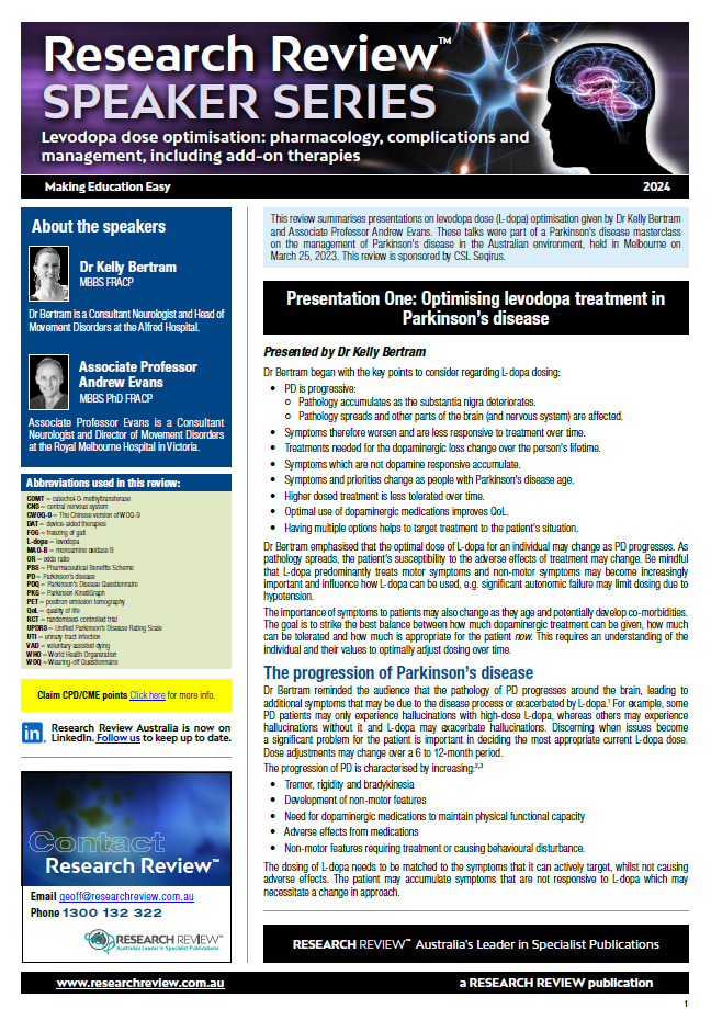 The presentations featured focus on levodopa dose (L-dopa) optimisation and were given by Dr Kelly Bertram and Associate Professor Andrew Evans. These talks were part of a Parkinson’s disease masterclass on the management of Parkinson’s disease in the Australian environment.