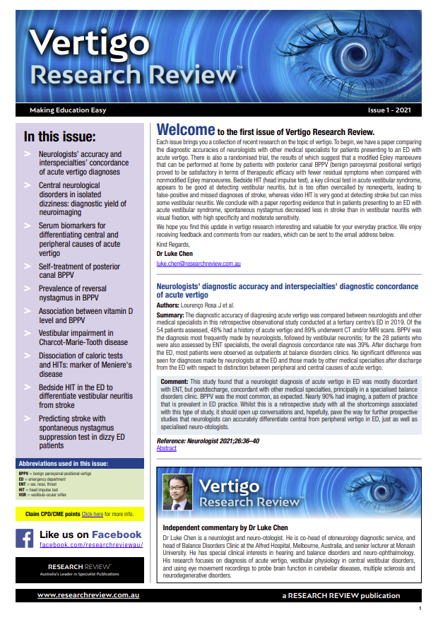 This Review features key medical articles from global journals with commentary from Dr Luke Chen. The Review covers topics such as central neurological disorders, dizziness, acute vertigo, benign paroxysmal positional vertigo, Meniere's disease, serum biomarkers, and stroke.
