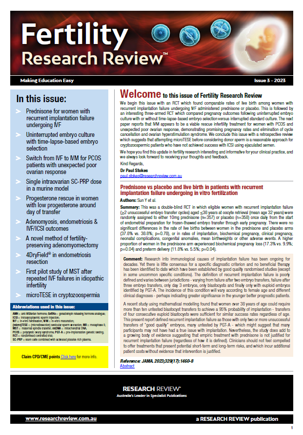 This Review features key medical articles from global Fertility journals with commentary from Dr Marcin Stankiewicz . The Review covers topics such as in vitro fertilisation (IVF), intrauterine insemination (IUI), azoospermia, and polycystic ovarian syndrome (PCOS).