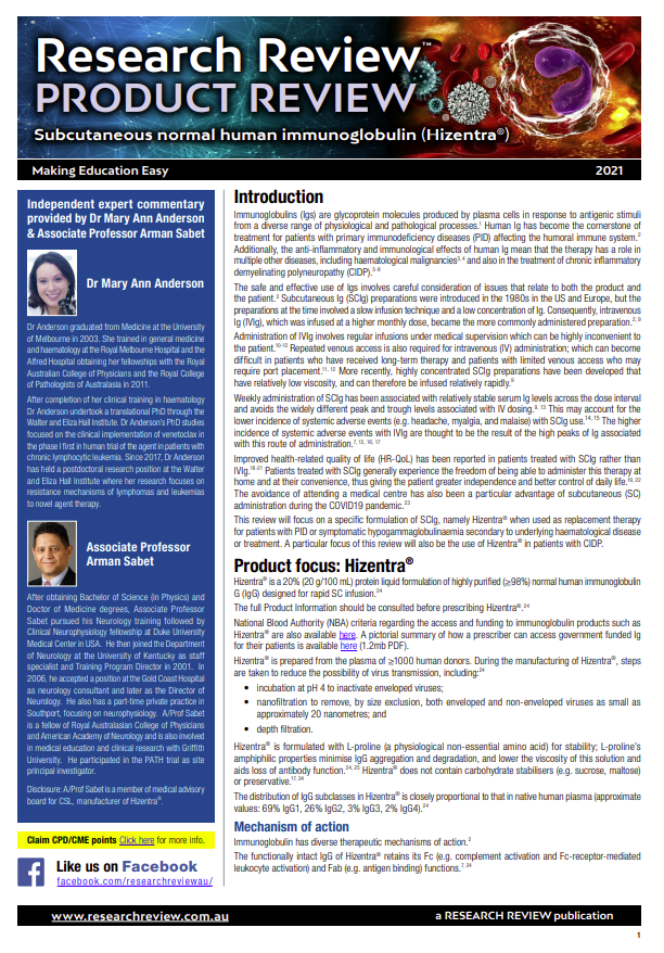 As part of our ongoing series focussing on new registrations in Australia, we have added a product review of the use of subcutaneous normal human immunoglobulin (Hizentra).