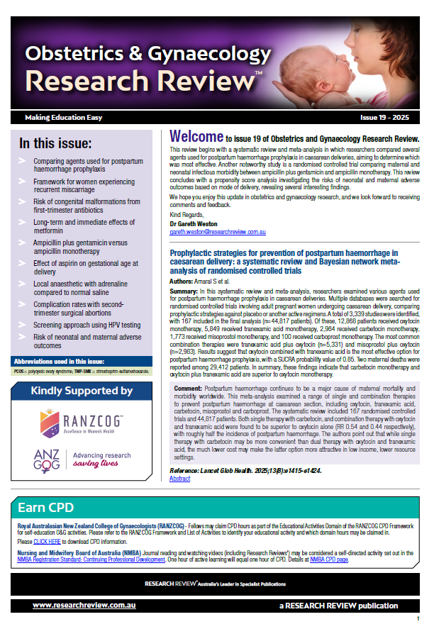 This review is a unique Australian publication providing topical, relevant and accessible information for health professionals with an interest in obstetrics and gynaecology. In essence, the review is a summary of what we consider to be some of the most significant new studies in this area.