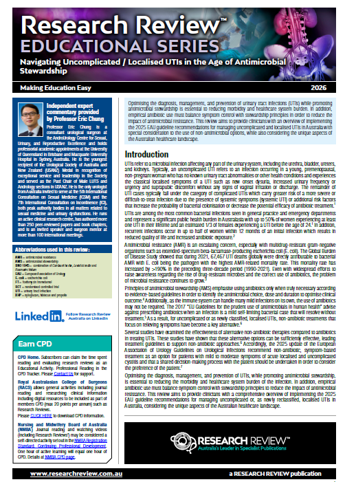 This Educational Review aims to provide clinicians with an overview of implementing the 2025 EAU guideline recommendations for managing uncomplicated and localised UTIs in Australia with special consideration to the use of non-antimicrobial options.