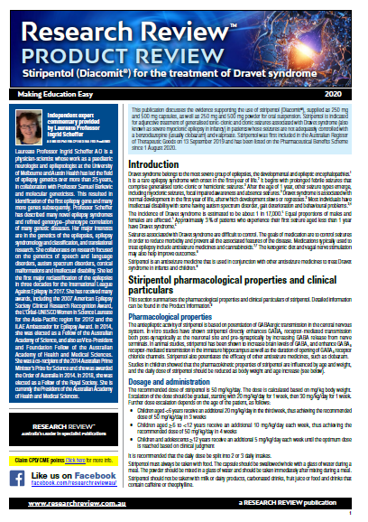 This review discusses the evidence in support of the use of Stiripentol, its pharmacological properties, dosage and administration, and efficacy and tolerability as demonstrated in pivotal clinical trials.