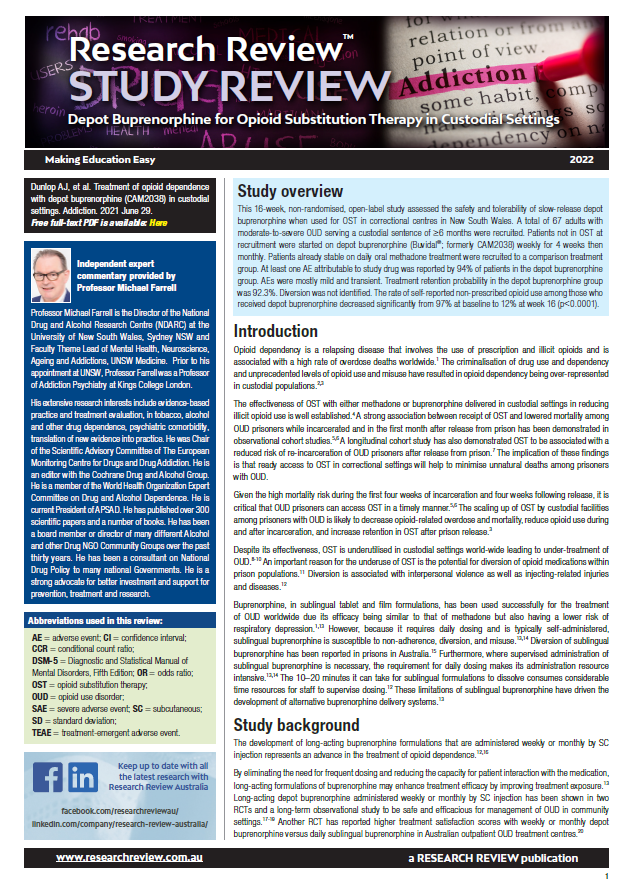 As part of our ongoing effort to bring you reports of interesting new studies, we have added a study that assessed the safety and tolerability of slow-release depot buprenorphine when used for opioid substitution therapy in correctional centres in New South Wales.