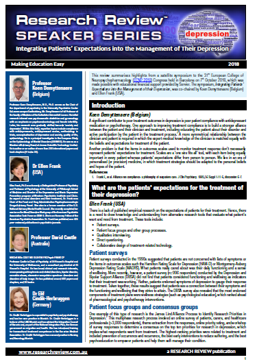 The symposium, Integrating Patients’ Expectations into the Management of their Depression, was co-chaired by Professor Koen Demyttenaere (Belgium) and Dr Ellen Frank (USA). Also part of the discussion were Professor David Castle from Melbourne and Dr Elif Cindik-Herbruggen from Germany.