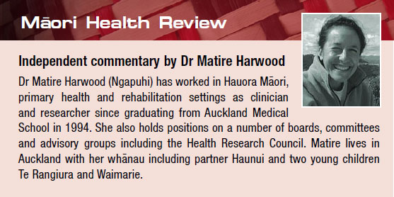 Welcome to this issue of the Māori Health Review. Each issue attempts to bring you research relevant to the health and wellbeing of Māori. I welcome feedback and suggestions for papers/research to include in future issues and I’m pleased to hear and read about the excellent work being undertaken in Hauora Māori. Nga mihi Matire Dr Matire Harwood matire@maorihealthreview.co.nz
