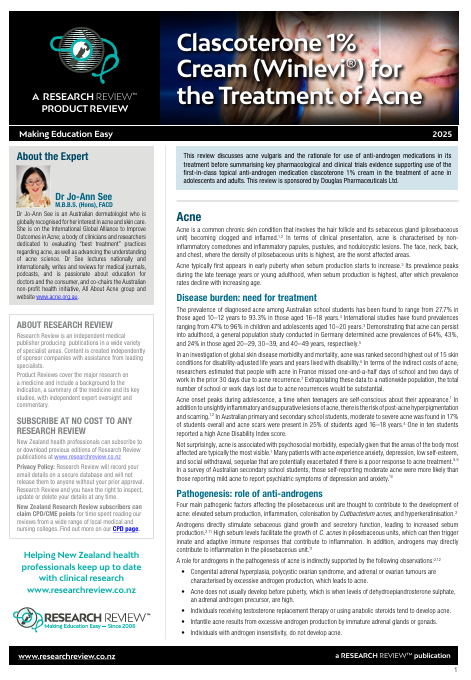 This review discusses acne vulgaris and the rationale for use of anti-androgen medications in its treatment before summarising key pharmacological and clinical trials evidence supporting use of the first-in-class topical anti-androgen medication clascoterone 1% cream in the treatment of acne in adolescents and adults. This review is sponsored by Douglas Pharmaceuticals Ltd.