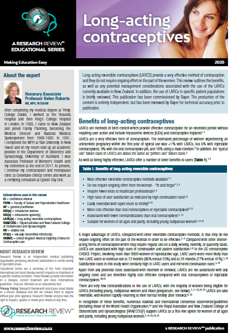 Long-acting reversible contraceptives (LARCS) provide a very effective method of contraception and they do not require ongoing effort on the part of the women. This review outlines the benefits, as well as any potential management considerations associated with the use of the LARCs currently available in New Zealand. In addition, the use of LARCs in specific patient populations is briefly reviewed. This publication has been commissioned by Bayer. The production of the content is entirely independent, but has been reviewed by Bayer for technical accuracy prior to publication.