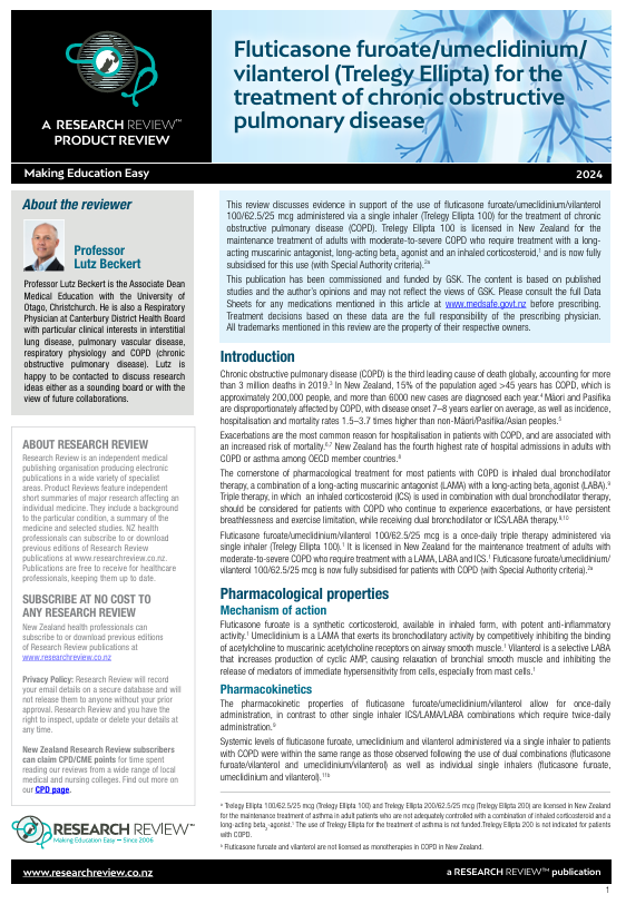 This review discusses evidence in support of the use of fluticasone furoate/umeclidinium/vilanterol 100/62.5/25 mcg administered via a single inhaler (Trelegy Ellipta 100) for the treatment of chronic obstructive pulmonary disease (COPD). Trelegy Ellipta 100 is licensed in New Zealand for the maintenance treatment of adults with moderate-to-severe COPD who require treatment with a long acting muscarinic antagonist, long-acting beta2 agonist and an inhaled corticosteroid,1 and is now fully subsidised for this use (with Special Authority criteria).
