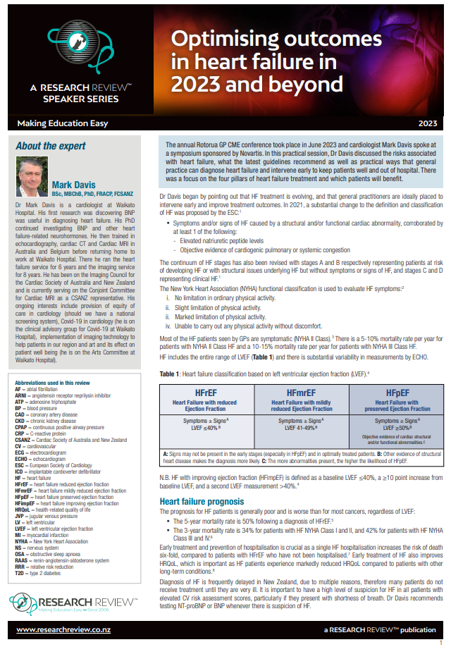 The annual Rotorua GP CME conference took place in June 2023 and cardiologist Mark Davis spoke at a symposium sponsored by Novartis. In this practical session, Dr Davis discussed the risks associated with heart failure, what the latest guidelines recommend as well as practical ways that general practice can diagnose heart failure and intervene early to keep patients well and out of hospital. There was a focus on the four pillars of heart failure treatment and which patients will benefit.
