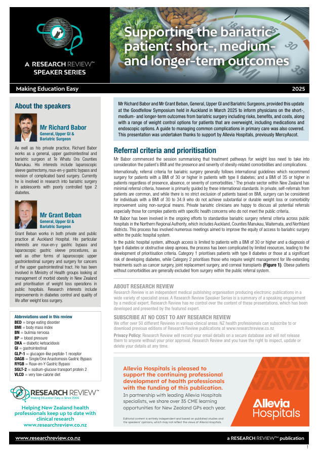 Mr Richard Babor and Mr Grant Beban, General, Upper GI and Bariatric Surgeons, provided this update at the Goodfellow Symposium held in Auckland in March 2025 to inform physicians on the short-, medium- and longer-term outcomes from bariatric surgery including risks, benefits, and costs, along with a range of weight control options for patients that are overweight, including medications and endoscopic options. A guide to managing common complications in primary care was also covered. This presentation was undertaken thanks to support by Allevia Hospitals, previously MercyAscot.