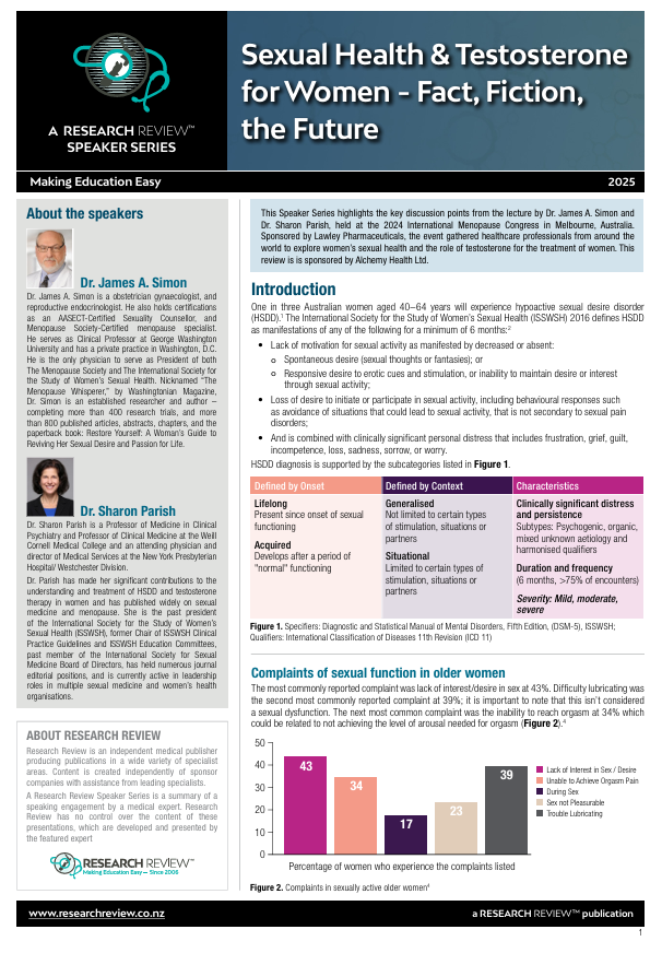 This Speaker Series highlights the key discussion points from the lecture by Dr. James A. Simon and Dr. Sharon Parish, held at the 2024 International Menopause Congress in Melbourne, Australia. Sponsored by Lawley Pharmaceuticals, the event gathered healthcare professionals from around the world to explore women’s sexual health and the role of testosterone for the treatment of women.