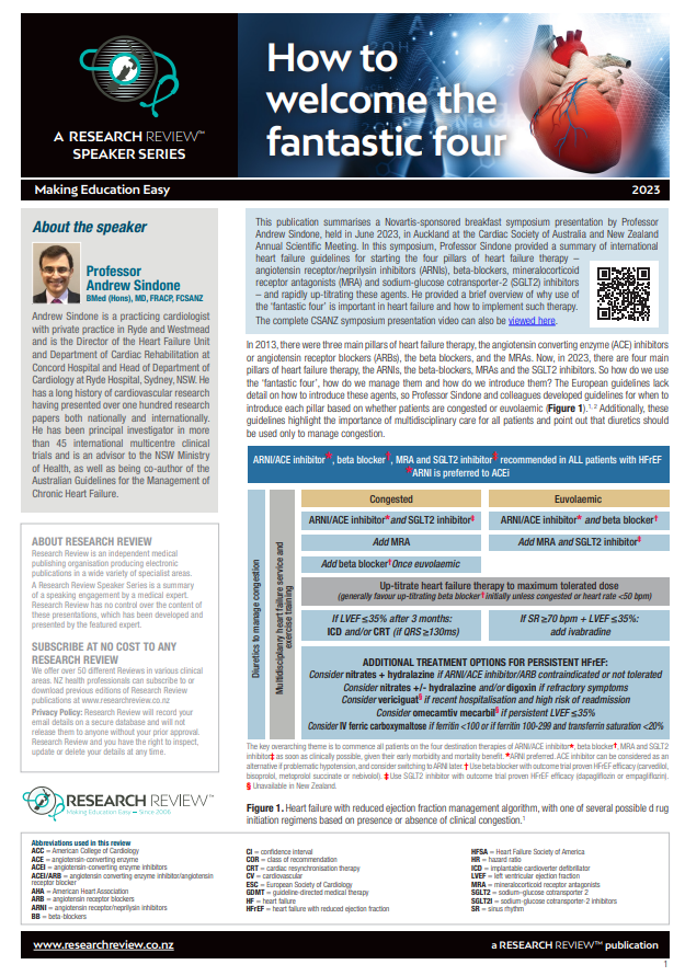 heart failure guidelines for starting the four pillars of heart failure therapy – angiotensin receptor/neprilysin inhibitors (ARNIs), beta-blockers, mineralocorticoid receptor antagonists (MRA) and sodium-glucose cotransporter-2 (SGLT2) inhibitors – and rapidly up-titrating these agents. He provided a brief overview of why use of the ‘fantastic four’ is important in heart failure and how to implement such therapy. The complete CSANZ symposium presentation video can also be viewed here.