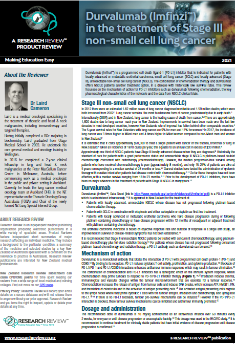 Durvalumab (Imfinzi™) is a programmed cell death ligand-1 (PD-L1) inhibitor that is indicated for patients with locally advanced or metastatic urothelial carcinoma, small cell lung cancer (SCLC) and locally advanced (Stage III), unresectable non-small cell lung cancer (NSCLC). The combination of chemoradiation therapy and durvalumab offers NSCLC patients another treatment option, in a disease with historically low survival rates. This review focusses on the mechanism of action for PD-L1 inhibitors such as durvalumab following chemoradiation, the key pharmacological characteristics of the molecule and the data from NSCLC clinical trials.