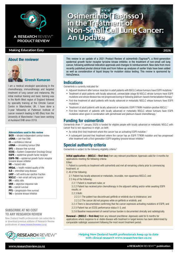 This review is an update of a 2021 Product Review of osimertinib (Tagrisso®), a third-generation epidermal growth factor receptor tyrosine kinase inhibitor, in the treatment of non-small cell lung cancer, following additional indication approvals and changes to reimbursement. New data from more recently published pivotal clinical trials and from follow-up analyses of earlier trials have been added as well as consideration of liquid biopsy for mutation status testing.