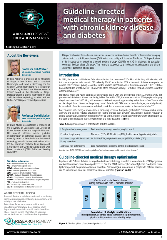 This publication is intended as an educational resource for New Zealand health professionals managing patients with chronic kidney disease (CKD) with comorbid type 2 diabetes. The focus of this publication is the importance of guideline-directed medical therapy (GDMT) for CKD in diabetes, in particular looking at the four pillars of therapy. This review is supported by an independent educational grant from Boehringer Ingelheim and Eli Lilly.