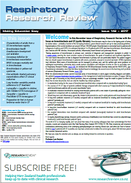 This Review features key medical articles from global respiratory journals with commentary from Professor Lutz Beckert. The Review covers topics such as COPD, pulmonary embolism, venous thromboembolism, emphysema, chronic bronchitis, cystic fibrosis, non-small cell lung cancer, obstructive sleep apnoea, corticosteroids and nebulisers.